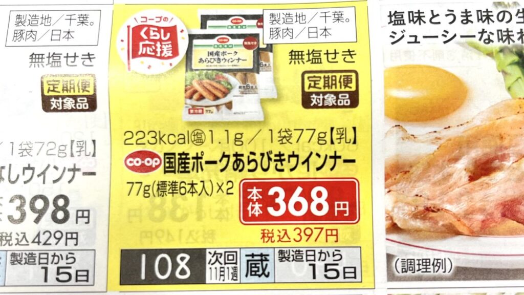 最後にご紹介するのは国産ポークあらびきウインナーです。国産ポークを使用し、発色剤(亜硝酸Na)を使用せず素材の味を生かした無塩せきウインナーなので安心です!我が家では朝食やお弁当、おつまみにも大活躍!焼くとパリッとした食感がたまらなく美味しいです。