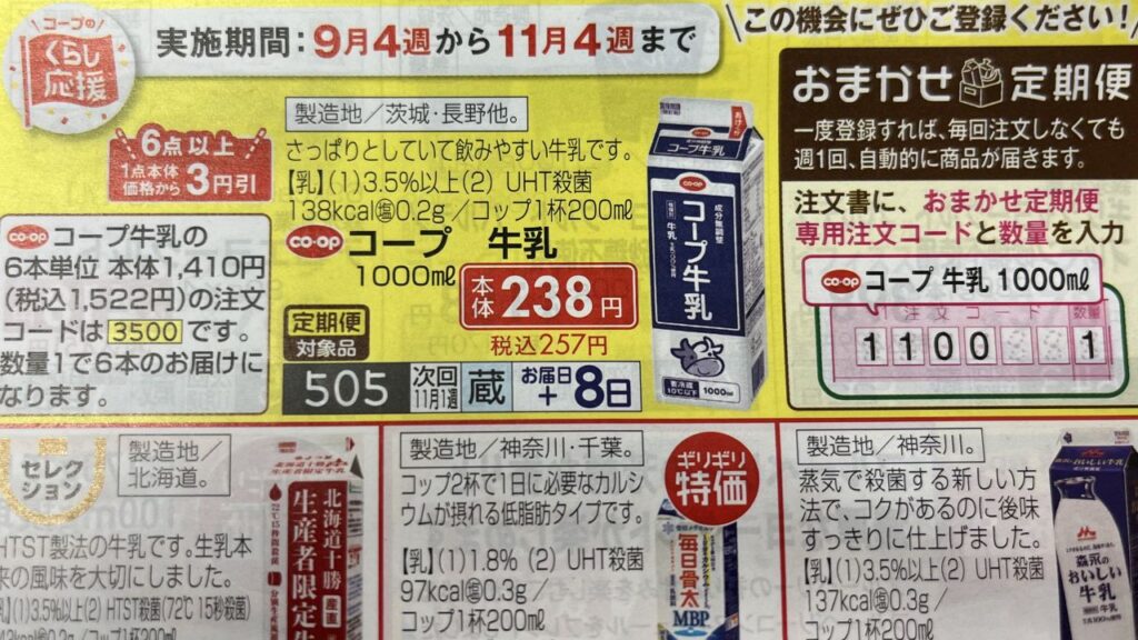 まずご紹介するのはコープ牛乳です。コクがありながらもすっきりとした飲み心地でとても美味しいです!朝ごはんやおやつの時間に牛乳を使うことが多いので、コーヒーに混ぜたり、スープなどの料理にも使っています。我が家では毎週欠かさず注文しています。
