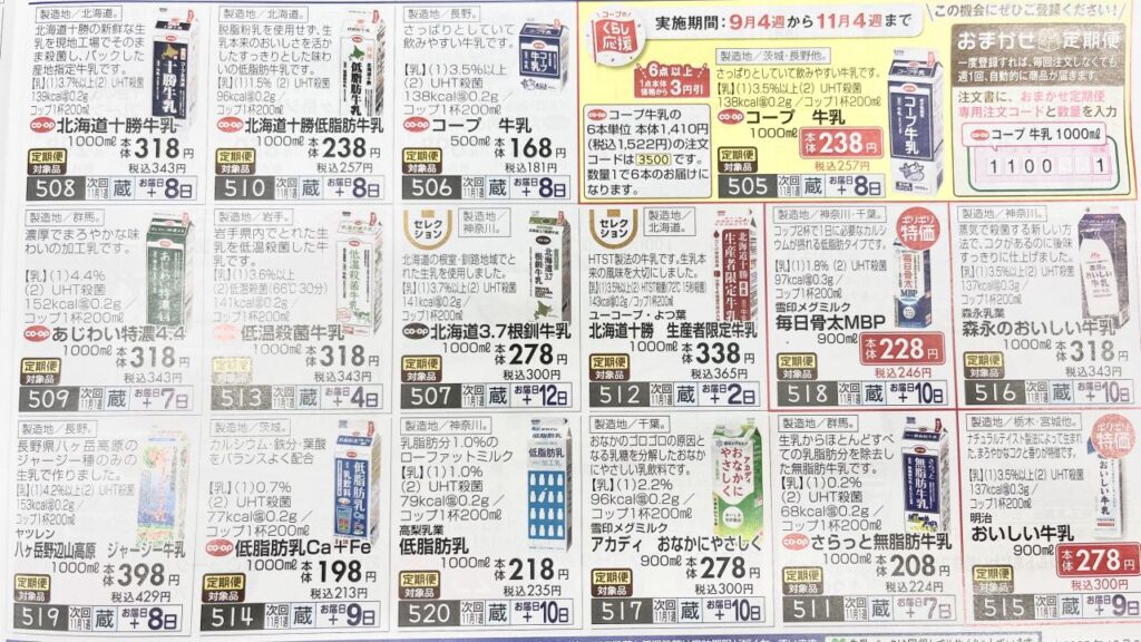 おうちコープの「おまかせ定期便」は、生協の個人宅配サービスおうちCO-OP(おうちコープ)で人気のアイテムを、1度登録すると定期的にお届けしてもらえる便利な仕組みです。毎週または2週に1回、4週に1回のペースで、同じ商品をおうちまで届けてくれるので、忙しい毎日でも食材の注文を忘れる心配がありません。日々消費する食品を中心に200品以上が対象になっています。特に牛乳の種類が豊富なのが特徴で、家族の好みに合わせて選べるのが嬉しいポイントです!